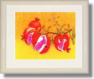 子孫繁栄・家運隆昌 沢山の実をつけ、しかも一粒一粒の実の中に種を宿す石榴は、古来より子宝の象徴として尊ばれてきました。ここに描かれた石榴の赤い実は、旺盛な活力、生命力の集合体として子孫繁栄、家運隆昌をもたらす吉祥画です。 |